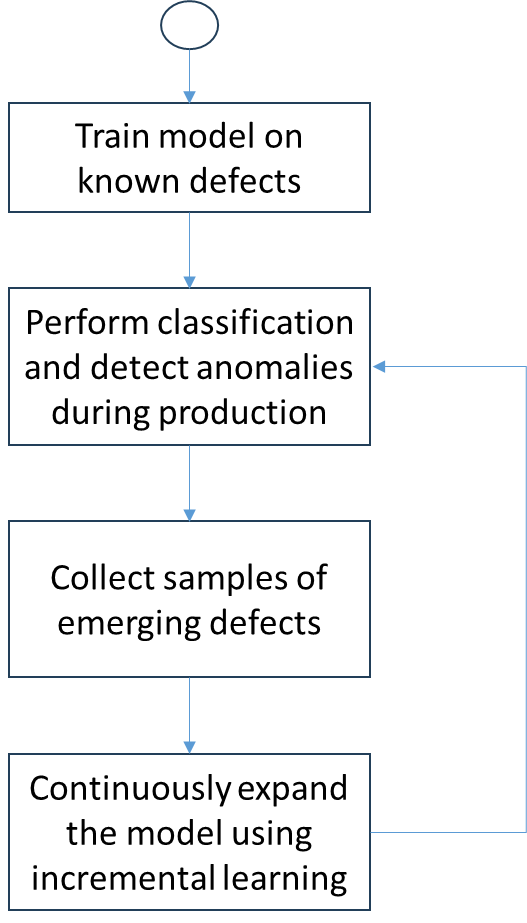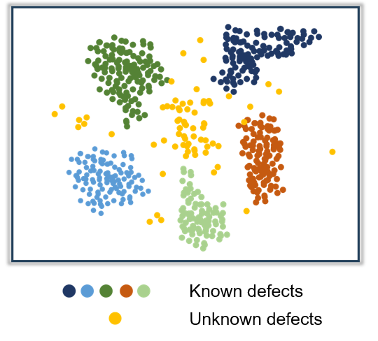在生產線上部署經過訓練的基本分類器模型,以識別已知缺陷的實例。同時監控生產過程中是否存在基本分類器標記為「未知」或「異常」的 任何輸入 - 這些可能是潛在的新的、不常見的缺陷。 - 收集新出現缺陷的樣本