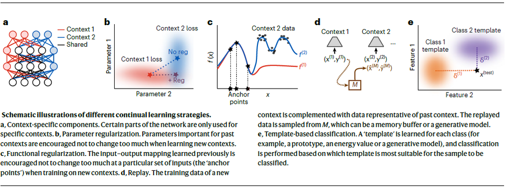 實現增量學習的策略有多種,包括訓練特定於上下文的元件、參數正則化、功能正則化、重播和基於模板的分類。各種策略可以圖形化表示 如下[2]: