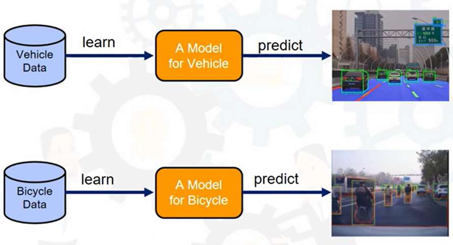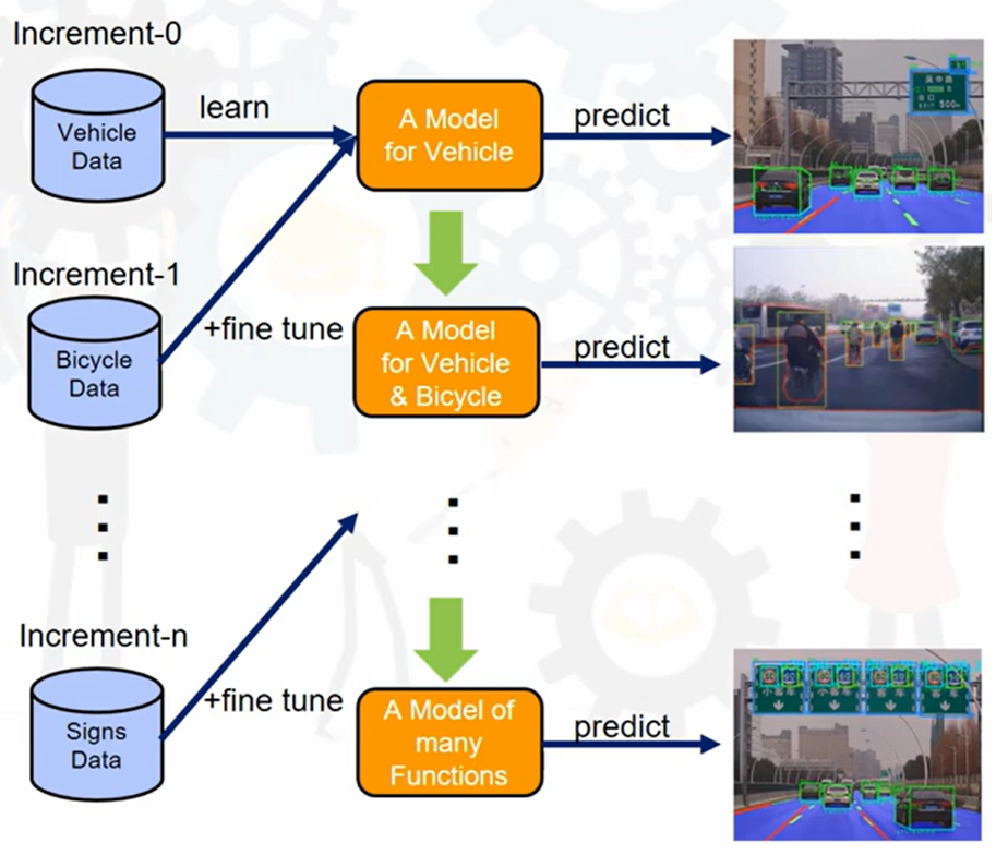 增量學習(也稱為持續學習)是一種機器學習方法,其中 AI 模型隨著時間的推移學習新訊息,並維護和擴展先前的知識。以下展示了自動駕駛汽車中的目標偵測範例。首先訓練車輛模型來偵測汽車。之後,如果同一個模型被訓練來檢測自行車,它可能會失去先前檢測汽車的知識。
